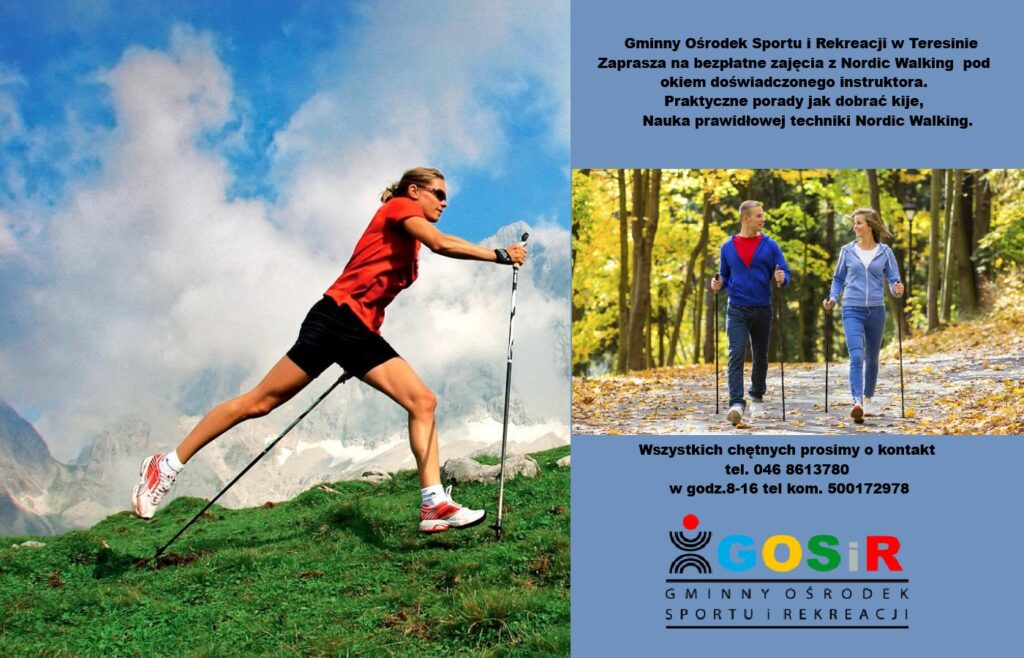 Gminny Ośrodek Sportu i Rekreacji w Teresinie Zaprasza na bezpłatne zajęcia z Nordic Walking pod okiem doświadczonego instruktora .Praktyczne porady jak dobrać kije, Nauka prawidłowej techniki Nordic Walking. Wszystkich chętnych prosimy o kontakt tel. 046 8613780 w godz. 8-!6 tel kom. 500172978