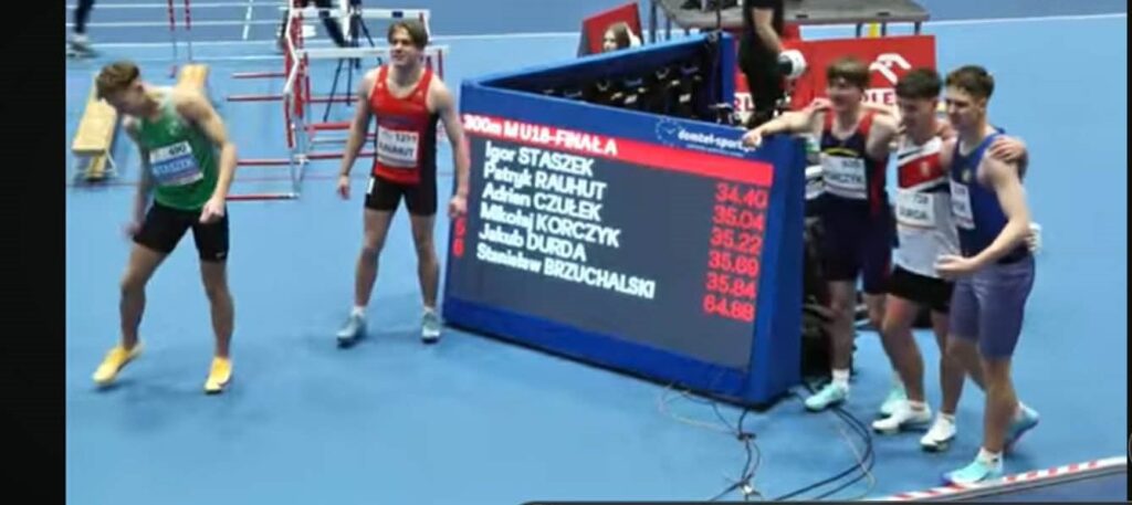 Adrian w pięknym stylu zdobywa Brązowy Medal Mistrzostw Polski U18 na dystansie 300m. Może się również pochwalić swoją nową życiówką, którą wykręcił podczas eliminacji – 35,10!!
